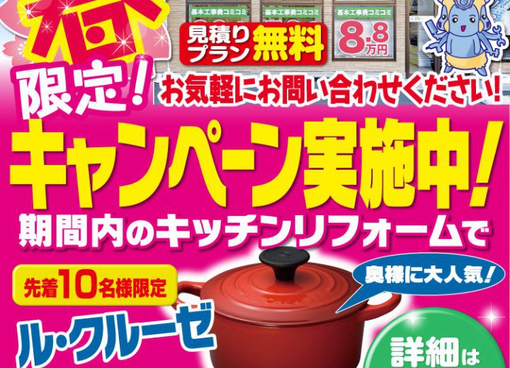 春ですね。 気温も暖かくなって リフォームやお部屋の模様替えなど したくなりませんか? 春のキャンペーンが始まりました。 何と!! キッチンご成約(59.8万円税別:657,800円税込以上のキッチン)の お客様先着10名様限定、 ル・クルーゼの鋳物ホーロー鍋を、 先着10名様限定でプレゼントいたします。 機能的でありながら、暮らしに彩りを添えます。 長く愛せる本物です。 期間は4月6日から4月26日まで。 無くなり次第終了とさせていただきますので リフォームをお考えの方々は チャンスです。 お早めに! ご予約ご相談おまちしております ご来店でもメールでもLINEでも 相談可能です! 是非この機会に、お考え下さい。