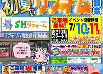 夏のリフォーム相談会開催いたします! ご来場は無料! ぜひ、お越しくださいませ! ご 来 場 特 典 アンケートにご記入いただいた方(1組様1セット)に 「BOXティッシュ」をプレゼント! さらに!! サイコロの出た目の数の「カップラーメン」を どどんとプレゼント。 お見積りをご依頼いただいた方には、 運試し大抽選会(ご家族様1回限り) を開催いたします! そして!水まわり設備を新しく、しようかなとお考えの皆さまにお知らせです! なんと!2日間限り キッチン・お風呂ご成約の方で 排水の詰まり・水漏れの 修理永久無料! ※リフォーム箇所に限ります。 お早めにご相談ください♪ =============================== キッチン・トイレ・洗面台・お風呂などの水廻りのリフォームから、 LDKリフォーム、給湯器の交換まで、 さまざまなリフォームを行っております。 リフォームのことで気になることがございましたら、 ぜひお越しくださいませ。 スタッフ一同心よりお待ちしております。 ============================== 日時:2021年7月10日(土)・7月11日(日) 10:00~17:00 場所:SHリフォーム 木田ショールーム あま市木田東新赤坪43-1 ご来場:無料 駐車場:あり ===================== イベントチラシはこちら↓