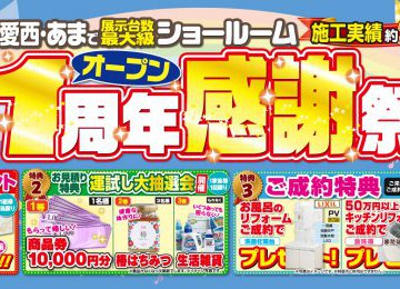 オープン1周年感謝祭開催いたします! 皆様のおかげで1周年を迎える事ができました。 ありがとうございます。 日頃の感謝を込めて、感謝祭を開催いたします。 ご来場は無料! ぜひ、お越しくださいませ! ご 来 場 特 典 アンケートにご記入いただいた方(1組様1セット)に 「BOXティッシュ」をプレゼント! さらに!! サイコロの出た目の数の「カップラーメン」を どどんとプレゼント。 お見積りをご依頼いただいた方には、 運試し大抽選会(ご家族様1回限り) を開催いたします! そして!水まわり設備を新しく、しようかなとお考えの皆さまにお知らせです! なんと!ご成約特典 キッチン・お風呂ご成約の方は 素敵なプレゼントを差し上げます! お早めにご相談ください♪ =============================== キッチン・トイレ・洗面台・お風呂などの水廻りのリフォームから、 LDKリフォーム、給湯器の交換まで、 さまざまなリフォームを行っております。 リフォームのことで気になることがございましたら、 ぜひお越しくださいませ。 スタッフ一同心よりお待ちしております。 ============================== 日時:2021年10月9日(土)・10月10日(日) 10:00~17:00 場所:SHリフォーム 木田ショールーム あま市木田東新赤坪43-1 ご来場:無料 駐車場:あり ===================== イベントチラシはこちら↓