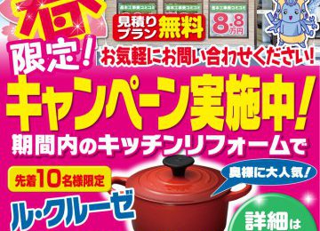 皆様、いつもSHリフォームをご愛顧いただきありがとうございます。 リフォームをご検討されているお客様に明るいキャンペーンの この春嬉しいキャンペーン‼が始まります。 何と キッチンご成約のお客様に(59.8万円税別:657,800円税込以上のキッチン)先着10名様限定でル・クルーゼ(鍋)をプレゼント‼ 期間は4月6日~4月26日とさせていただきますので リフォームをお考えの方々は またとないチャンスです お早めに! ご予約ご相談おまちしております リモートでもLINEでも 相談可能です! お気軽にご相談ください!