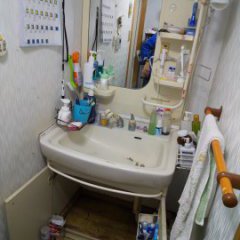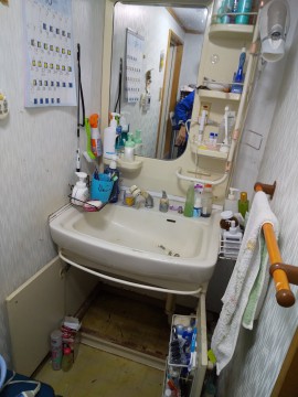 排水の漏れにより洗面台下が濡れており、部品の取り寄せもできない古い洗面台のため、新しい洗面台に交換したいとご要望がありました。