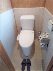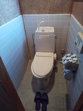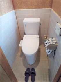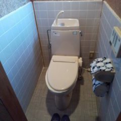 便座が破損し、使いにくくなったトイレです。20年くらい前の一体型のトイレのため、部品交換などができず、トイレ取替を希望の施主様です。